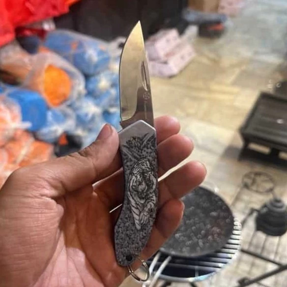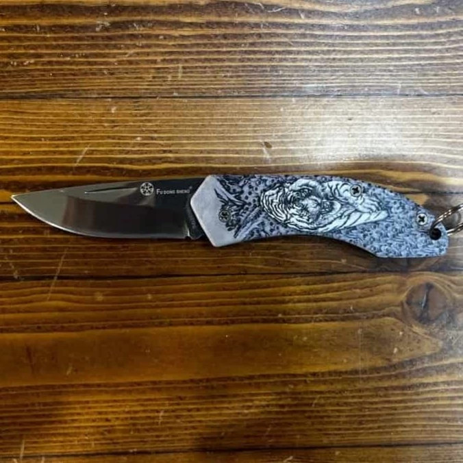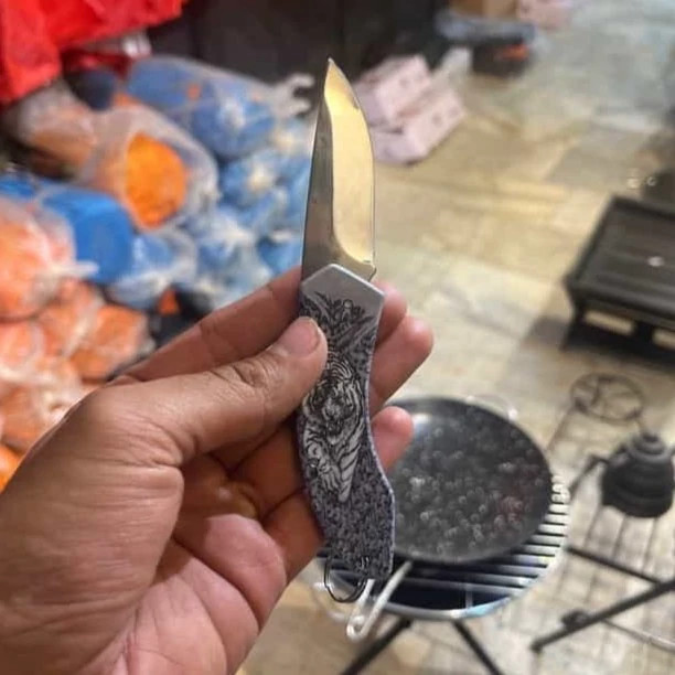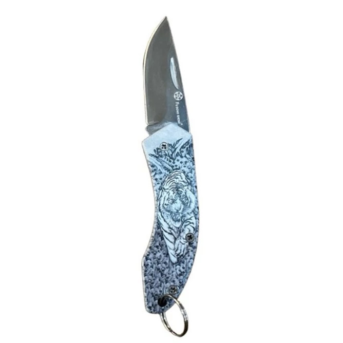 دسته این چاقو با طرح ببر طراحی شده که علاوه بر زیبایی و ظاهر خاص، حس قدرت و ماجراجویی را القا میکند و آن را به گزینهای جذاب برای علاقهمندان به طبیعت تبدیل کرده است.