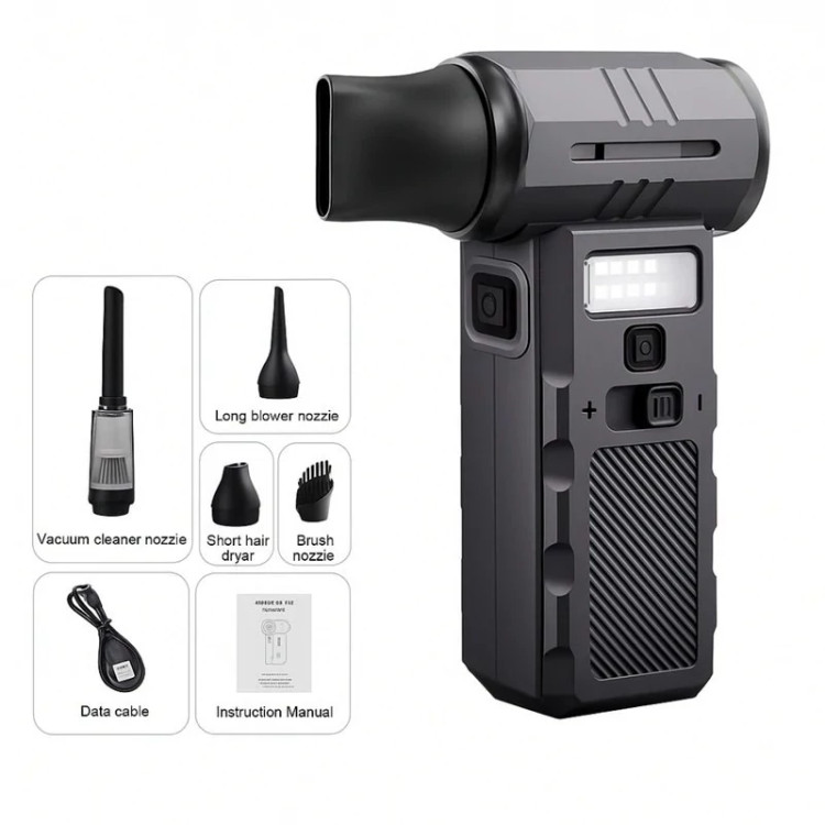 جت فن و وکیوم شارژی VIOLENT F028 یک ابزار چندمنظوره و بسیار قدرتمند است که ترکیبی از فن پرقدرت، دمنده، مکنده (وکیوم)، نور جانبی و نازلهای کاربردی را در یک دستگاه کوچک و قابلحمل ارائه میدهد. این مدل برای تمیزکاری کامپیوتر، لپتاپ، کیس، فضای خودرو، کمپینگ، خشککردن مو و ابزار، باد کردن و حتی استفاده بهعنوان نور اضطراری کاملاً مناسب است.