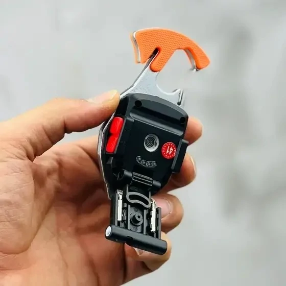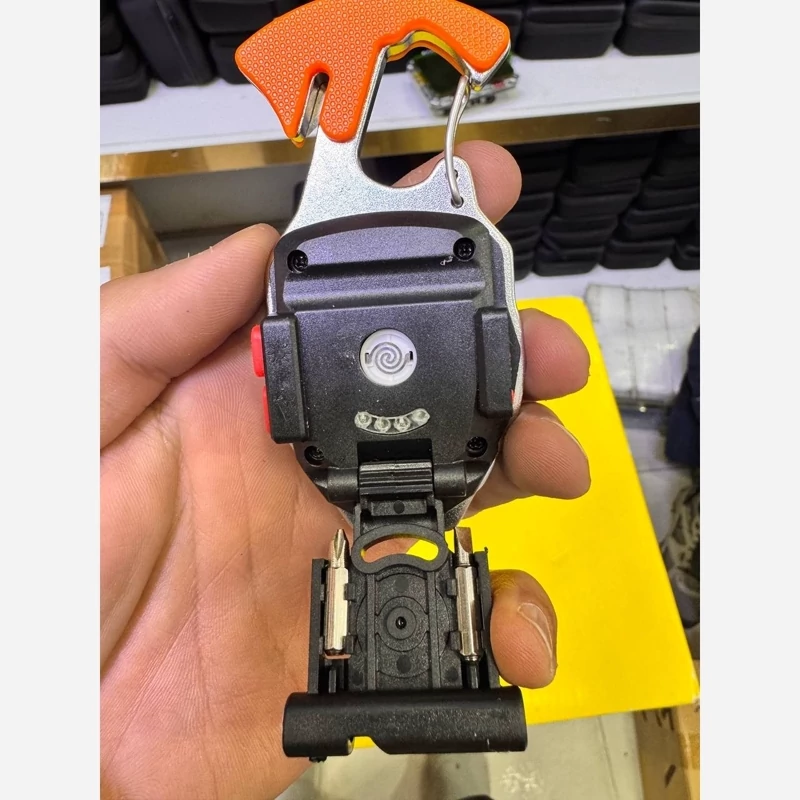 اما جادوی واقعی زمانی رخ میدهد که به بدنه این گجت نگاه میکنید. اسمال سان در طراحی این مدل، شاهکاری از مهندسی فشرده را به نمایش گذاشته است. در پشت بدنه، یک فندک المنتی تعبیه شده که بدون نیاز به گاز و تنها با نیروی باتری، آتش را برای شما مهیا میکند. یک سوت بلند برای درخواست کمک، یک تیغ برش تیز برای بریدن کمربند ایمنی یا طناب، و یک درب بازکن بطری، همگی در این بدنه کوچک جا شدهاند. حتی برای کارهای فنی، دو عدد پیچگوشتی (دو سو و چهار سو) در بدنه مخفی شدهاند تا در تعمیرات فوری به کارتان بیایند.