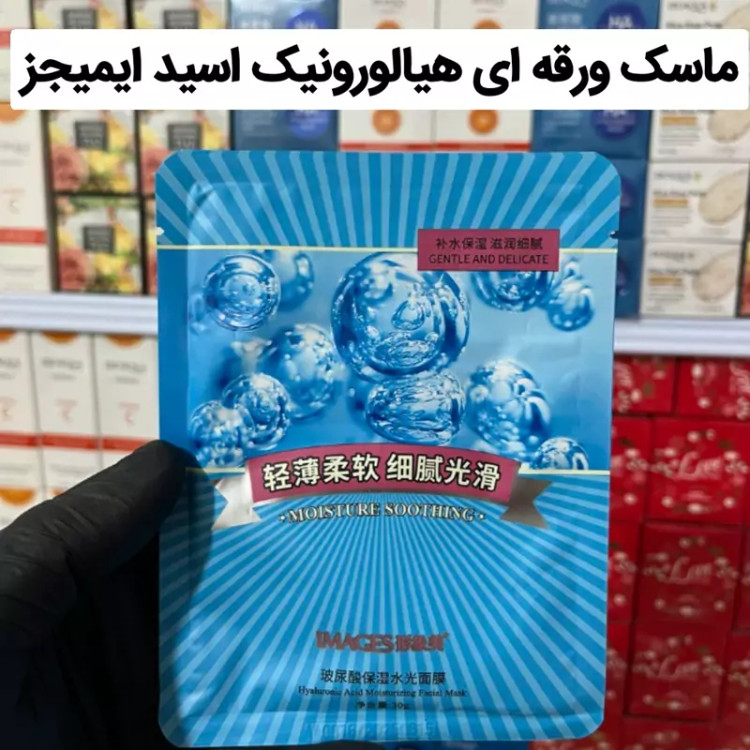 ماسک ورقه ای هیالورونیک اسید برند : ایمیجز 25 گرم آبرسان قوی پوست صورت خاصیت ترمیم کنندگی خنک کننده و لطافت بخش شاداب کننده پوست