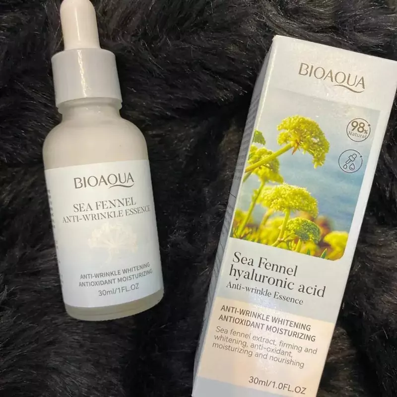 ویژگی های اسنس رازیانه دریایی بیوآکوا مناسب انواع پوست حاوی عصاره رازیانه دریایی و هیالورونیک اسید جلوگیری از پیری پوست و ایجاد چین و چروک مغذی، مرطوب کننده رفع لکه های تیره پوست روشن و سفید کننده پوست آنتی اکسیدان