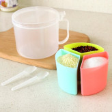 جا ادویه سه تایی دسته دار ، محصولی با طراحی جدید و فانتزی می باشد که تولید شده از جنس پلاستیک مقاوم و بسیار با کیفیت است . این جا ادویه ای فانتزی ، طرح ظاهری مشابه به یک استوانه را دارد و شامل سه محفظه مجزا برای نگهداری ادویه به همراه سه قاشق می باشد که در یک محفظه اصلی مجهز به درب آسان بازشو قرار دارند . رنگ این محصول ترکیبی می باشد که زیبایی خاصی را به آن می دهد . استفاده از این جای ادویه به دلیل داشتن دستگیره ، در هنگام آشپزی کار بسیار ساده ای است.