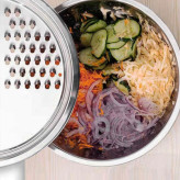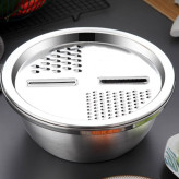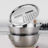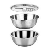 ست لگن و آبکش رنده دار ، ابزاری کاملاً کاربردی و مورد نیاز برای هر آشپز حرفه ای است . این ست شامل یک لگن ، یک عدد آبکش و یک صفحه رنده می باشد که بر روی خود چهار تیغه متفاوت رنده ثابت دارد . هر سه کالا سایز 26 سانتی متر و تولید شده از جنس استیل هستند که مقاومت و در عین حال کیفیت بسیار بالایی را دارند . ویژگی اصلی لگن استیل رنده دار ، قابلیت قرارگیری هر سه ظرف درون هم می باشد ، بنابراین برای استفاده از هرکدام از آنها در شرایط مختلف نیازی به بهره گیری از ظرف متفرقه دیگری وجود ندارد ، در صورت لزوم می توانید رنده را بر روی لگن و یا آبکش قرار دهید و مواد غذایی مورد نظر خود را با استفاده از یکی از تیغه های تعبیه شده بر روی آن به سادگی رنده و درون ظرف جهت شست و شو ، آبکشی و یا حتی آماده سازی غذا بریزید . کافیست آبکش را درون لگن قرار داده و مواد غذایی را نیز داخل آن جای دهید ، پس از شست و شوی کامل آنها درون آب داخل لگن ، آبکش را به سمت بالا بیاورید تا به سادگی آب از آن جدا شود . از لگن نیز می توان برای موارد و مصارف گوناگون از شست و شوی مواد غذایی ، میوه و سبزیجات تا حتی استفاده به عنوان یک ظرف سرو غذا و سالاد به دلیل ظاهر زیبا و همچنین فضای جادار آن استفاده نمود . قابلیت شست و شوی آسان در کنار اشغال فضای اندک را نیز به سایر خصوصیات لگن و آبکش رنده دار اضافه کنید . با ابزار کاربردی آشپزخانه ، ساده ، حرفه ای و با لذت آشپزی کنید .