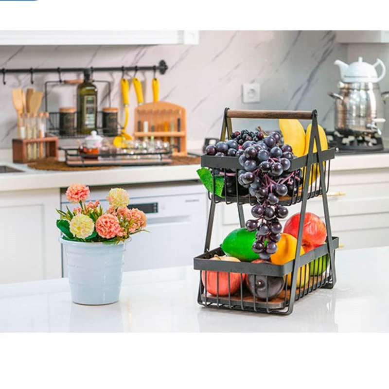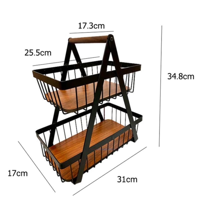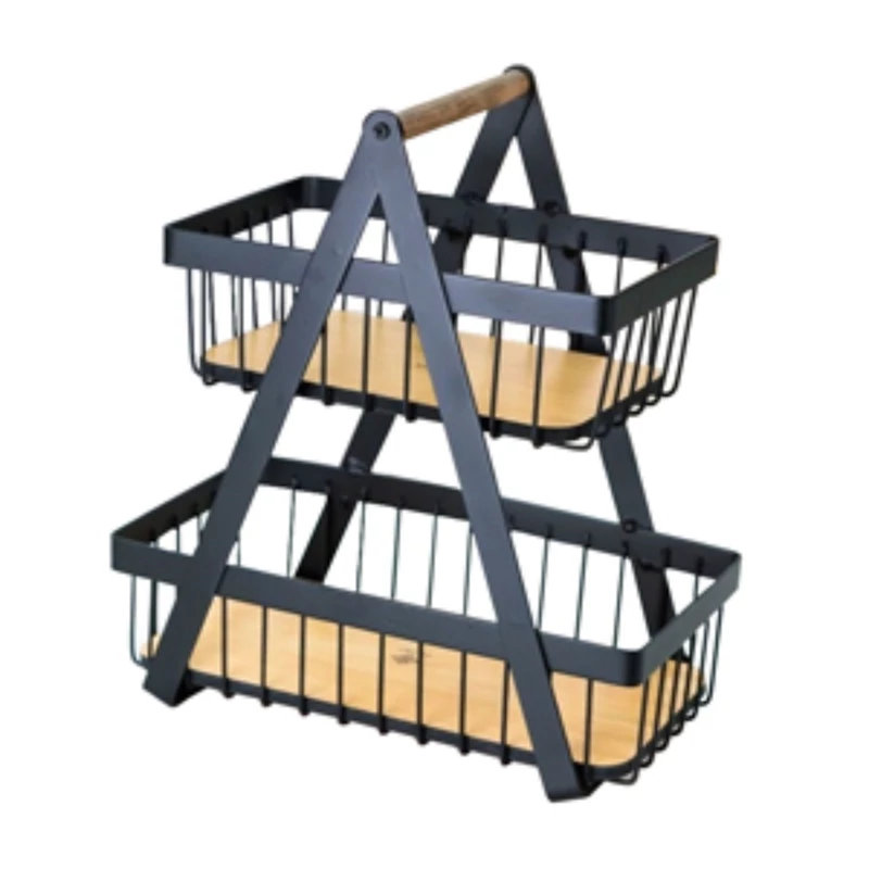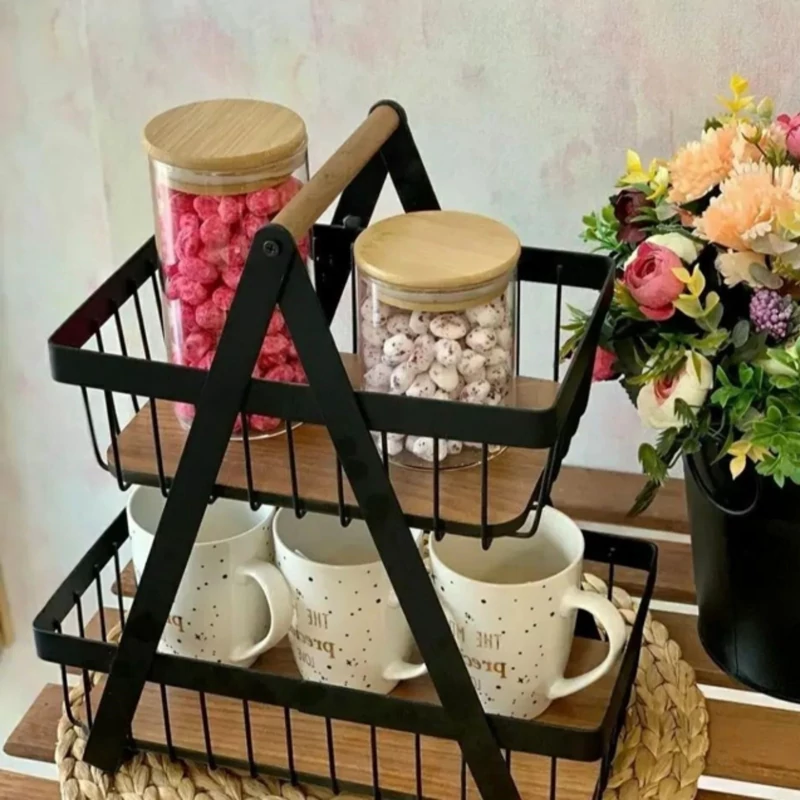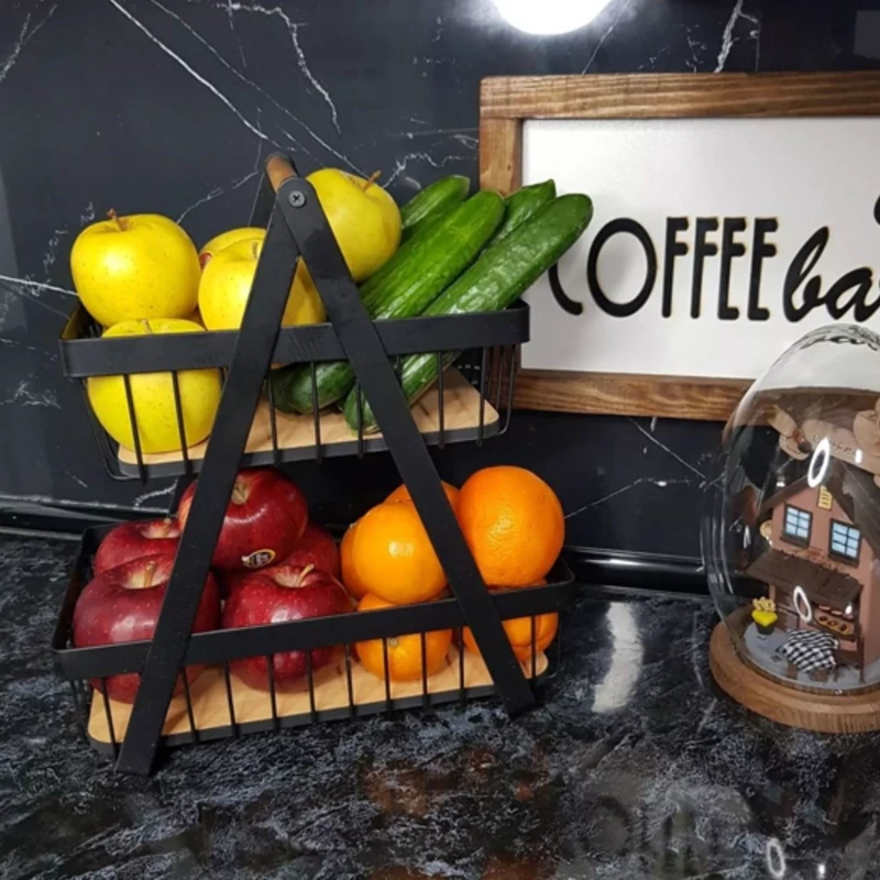 سبد میوه دو طبقه سالوت ، یک سبد پذیرایی جدید با طراحی ظاهری زیبا و در عین حال متفاوت است . این سبد از جنس فلز با لایه رنگ استاتیک مشکی بر روی آن در دو طبقه با ابعاد متفاوت از یکدیگر تولید شده . اطراف هر سبد را حفاظ های میله ای شکل باریک با فاصله یکسان پوشش داده اند تا محتویات درون سبد از بیرون ریختن حفظ شوند . سبدها در دو سایز کوچک و بزرگ هستند که بر روی یکدیگر به صورت هرمی قرار می گیرند . وظیفه نگهداری سبدها به صورت ثابت در این حالت بر عهده یک اتصال نردبانی به شکل عدد 8 می باشد که بازوهای آن در دو طرف سبدها قرار گرفته اند ، بدین تریتب سبد کوچک با ارتفاعی مشخص و مناسب بر روی سبد بزرگ تر قرار می گیرد . کف هر یک از طبقات ، لایه ای چوبی قرار داده شده که علاوه بر تأثیر در زیبایی ظاهری کالا ، مانع از پایین ریختن میوه ها از کف می شود و در نهایت دستگیره چوبی تعبیه شده در رأس هرم که قابلیت حمل و جابه جایی آسان محصول را فراهم آورده است . از سبد دو طبقه فلزی برای سرو میوه بر روی میز پذیرایی منزل و مراسم های مختلف می توان استفاده نمود ، جلوه زیبایی که میوه ها در دو طبقه بر روی یکدیگر به نمایش می گذارند ، صحنه ای متفاوت و خاص را بر روی میز پذیرایی شما پدید خواهد آورد . علاوه بر میوه می توانید از این سبد دوطبقه برای نگهداری لوازم و وسایل مختلف خود نظیر شیشه های ادویه بر روی کابینت آشپزخانه خود بهره ببرید .