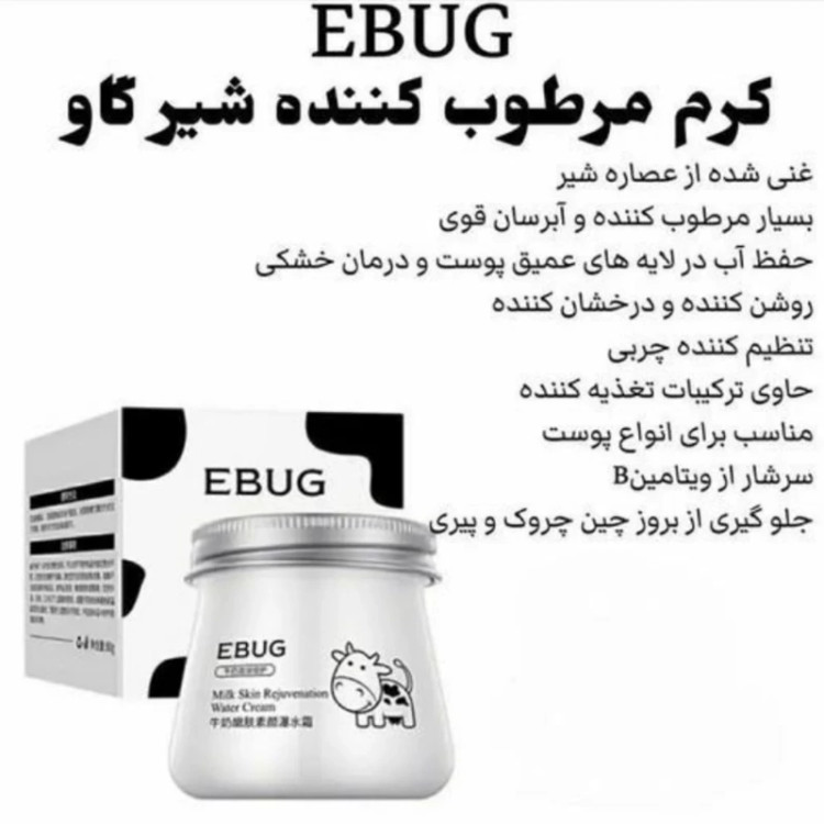 کرم آبرسان و مرطوب کننده شیر گاو مدل ایباگ ، محصولات پوستی سانیا🤗🤗 ویژگی های محصول : 👇👇 کرم مرطوب کننده شیر گاو ایباگ چه ویژگی هایی دارد؟ کرم مرطوب کننده شیر گاو ایباگ یک کرم مرطوب کننده و آبرسان با خاصیت رفع خشکی پوست حاوی پروتئین شیر گاو است. آبرسان شیر گاو ایباگ حاوی پروتئین و سرشار از مواد مورد نیاز پوست قابل استفاده روزانه جهت شادابی پوست میباشد. حجم 80 گرم جذب بسیار سریع لطیف کننده پوست شاداب کننده پوست حاوی عصاره شیر گاو روشن کننده سریع پوست نرم کننده ، کمک به زیبایی پوست حفظ آب در لایه های عمیق پوست رفع خطوط ریز ، افزایش شادابی پوست ضد پیری ، رفع خطوط ریز و درشت پوست حاوی پروتئین ، ویتامین و مواد مورد نیاز پوست ترکیب فوق العاده آبرسان و مرطوب کننده پوست مناسب انواع پوست ها خصوصا پوستهای خشک سرشار از کلسیم طبیعی و انواع مواد مغذی پوست نحوه استفاده از کرم آبرسان و مرطوب کننده چیست؟ جهت استفاده از کرم شیر ایباگ ، ابتدا پوست خود را شستشو دهید. سپس مقداری از کرم را روی پوست قرار داده و کمی ماساژ دهید. توصیه میشود 2 بار در روز ، صبح و عصر از محصول استفاده نمایید