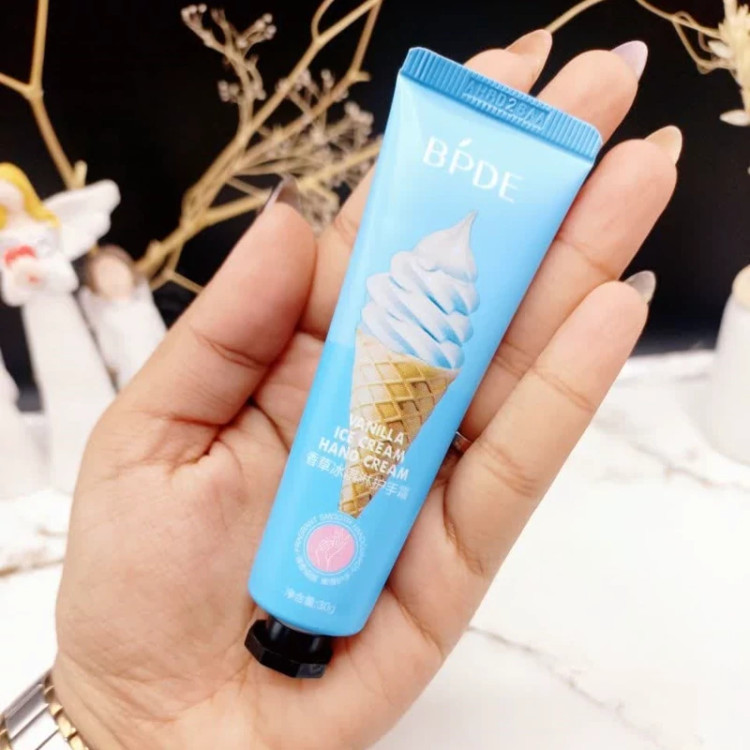 کرم دست طرح بستنی بیپد دارای بافت سبک آبرسان و فاقد چربی نرم کننده و روشن کننده پوست