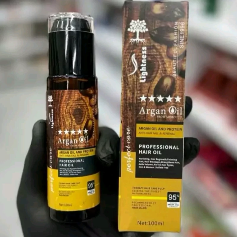 روغن آرگان لایتنس حاوی 95 درصد روغن آرگان طبیعی در ترکیبات خود است. که باعث نرمی و لطافت بافت مو شده و ساقه مو را تقویت می کند. روغن آرگان از خواص فوق العاده ای برخوردار است از جمله اینکه، باعث درخشان شدن و شادابی بافت مو می شود. وزی و خشکی را از بین برده و از ایجاد موخوره و شکنندگی نیز جلوگیری میکند. روغن آرگان حاوی مقادیر زیادی اسید چرب و ویتامین E است که باعث تقویت و سلامت ساختار مو شده و موهایی سالم و زیبا را به ارمغان می آورد. روغن آرگان لایتنس، بدون سولفات است بنابراین از موها به خوبی مراقبت و محافظت کرده و موهایی درخشان را به شما می بخشد. همچنین بخاطر نداشتن سولفات موهای کراتینه به راحتی میتوانند از آن استفاده کنند. روغن آرگان لایتنس رطوبت مو را حفظ کرده و از ریزش مو جلوگیری میکند.