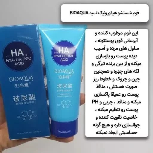 فوم شستشوی صورت HA اسید هیالورونیک بیوآکووا ، محصولات پوستی سانیا 😍😍😍😍 فوم شستشو صورت هیالورونیک اسید بیوآکوا بسته بندی تیوپی 100 گرمی دارای خاصیت ابرسانی و مرطوب کنندگی بهترین فوم شستشوی صورت برای پوست خشک پاک کننده بی نظیر آرایش پاکسازی عمیق پوست صورت رفع چین و چروک و خطوط ریز صورت شاداب کننده و جوان کننده پوست ضد حساسیت و بدون عوارض ترمیم عیوب پوست صاف و یکدست ساختن پوست چرا باید از فوم شستشوی صورت هیالورونیک اسید بیوآکوا استفاده کنید ؟ هیچ آرایشی قرار نیست برای همیشه بر روی پوست شما جا خوش کند. بالاخره یک زمان باید آن را پاک کرد. پس بهتر است همواره حداقل یک نوع پاک کننده آرایشی باکیفیت و کاربردی در کیف آرایشی و یا بر روی میز آرایشتان و در بین محصولات مراقبتی و بهداشتی که استفاده می کنید، داشته باشید تا در کوتاه ترین زمان ممکن و با بیشترین بازده اقدام به پاکسازی کامل آرایش و پوست خود بکنید. هرچه آرایش شما کامل تر و قوی تر باشد، نیاز به استفاده از پاک کننده باکیفیت بیشتر احساس می شود. اما یک پاک کننده آرایش ایده آل به جز قدرت پاکسازی بالا، باید همزمان یک مرطوب کننده، آب رسان، تغذیه کننده و ترمیم کننده قوی نیز باشد. فوم شستشوی صورت هیالورونیک اسید بیوآکوا یک شوینده آرایشی – مراقبتی و بهداشتی فوق العاده قدرتمند و پرفروش از سری محصولات بیوآکوا می باشد که در میان انبوه شوینده های موجود در بازار از برند های مختلف و همچنین از برند بیوآکوا، فروش بسیار بالایی دارد و مورد توجه بیشتری قرار گرفته است.