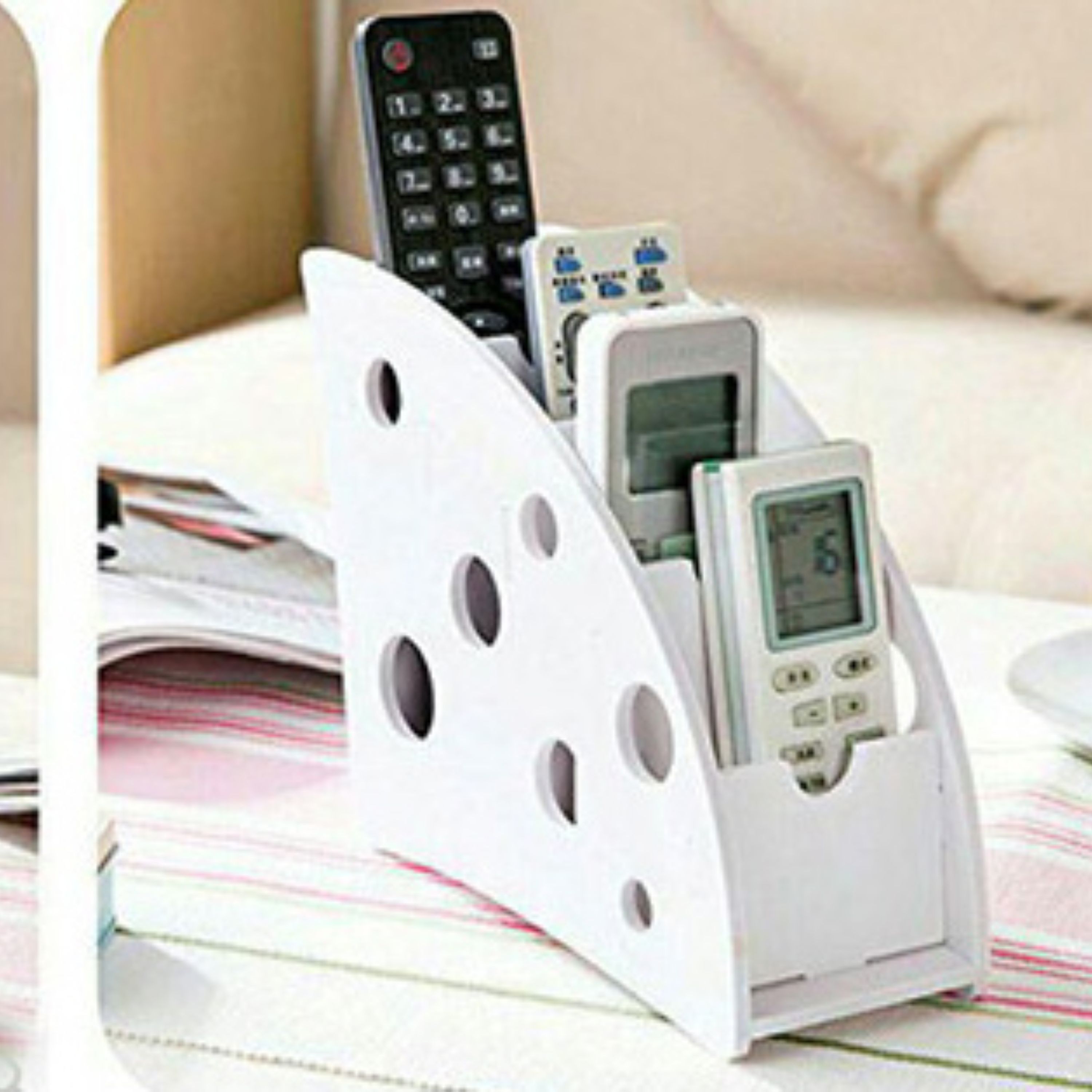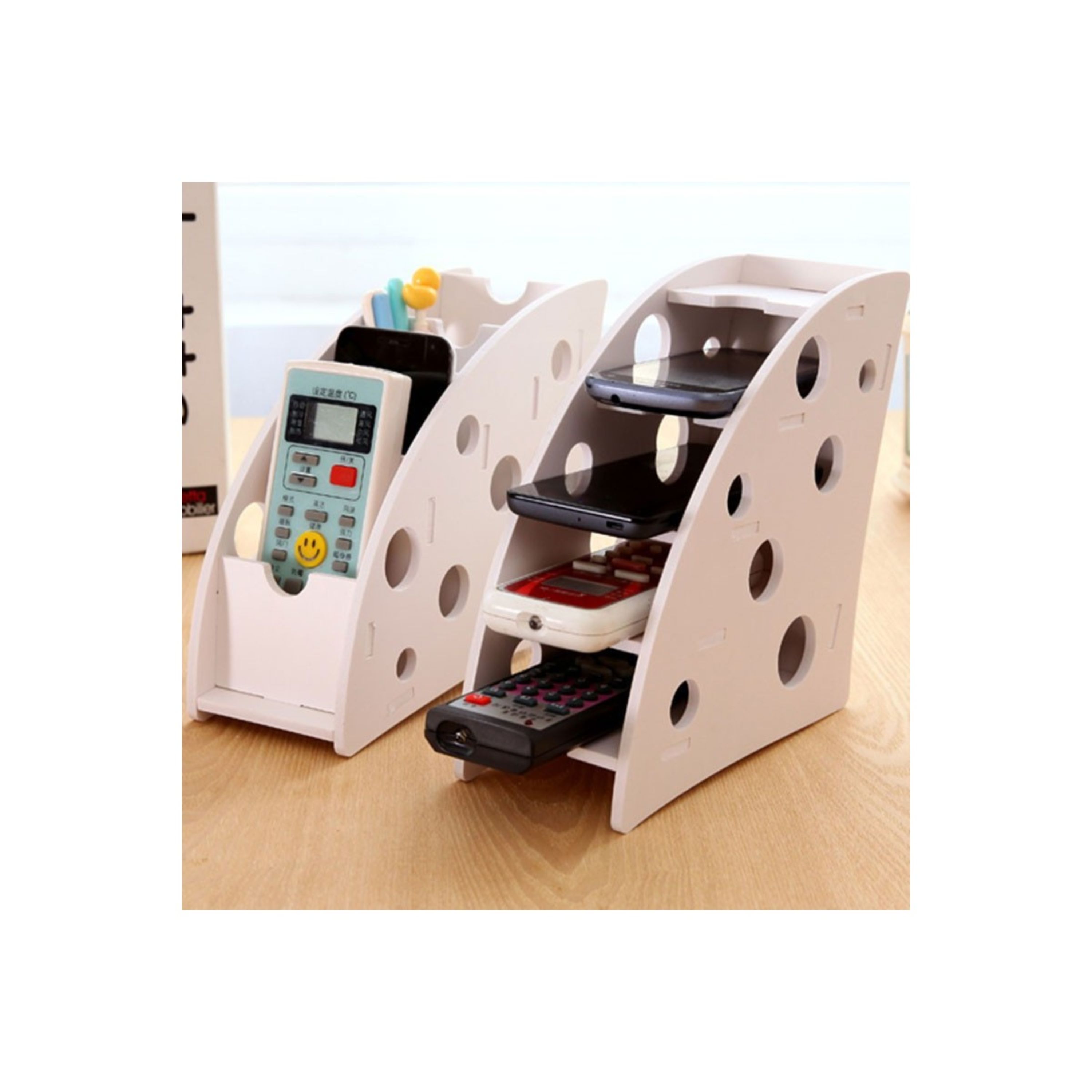 شلف جا کنترلی و جا لوازمی دو حالته ، محصولی با طراحی فانتزی زیبا و در عین حال جدید است . این شلف تولید شده از جنس پی وی سی می باشد و قابلیت استفاده در دو حالت عمودی و افقی را دارد . شما می توانید از این شلف فانتزی ، علاوه بر قرار دادن کنترل تلویزیون و لوازم دیجیتالی ، برای وسایلی مانند لوازم التحریر و ... نیز استفاده نمایید . شلف جا کنترلی و جا لوازمی دو حالته ، یک شلف رومیزی می باشد و به سادگی برای وسایل مختلف قابل استفاده است
