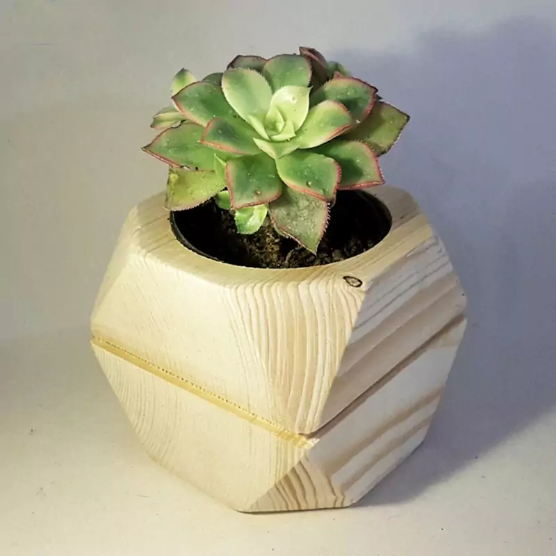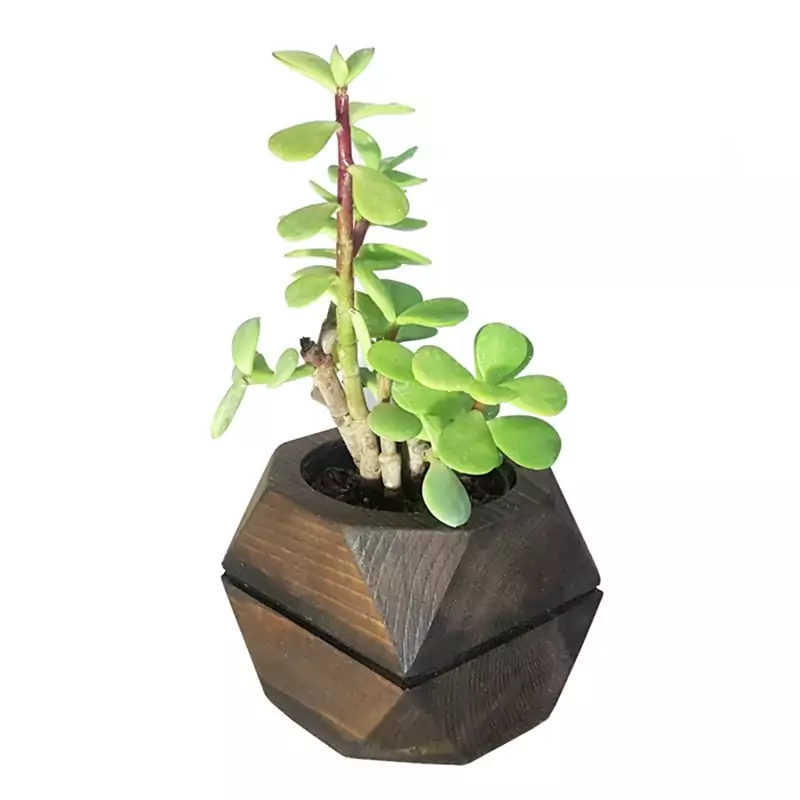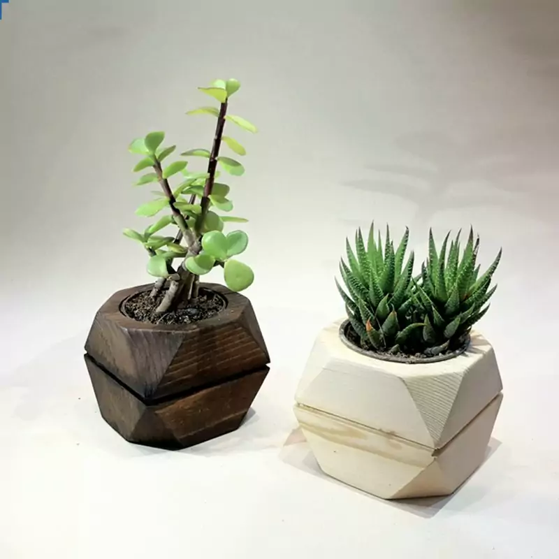 گلدان چند ضلعی چوبی ، محصولی با طراحی ظاهری متفاوت در ابعاد فانتزی برای کاشت انواع گیاهان کوچک تزیینی نظیر کاکتوس می باشد . این کالا تولید شده از جنس چوب مرغوب و باکیفیت بوده که درون خود یک گلدان مجزا با قابلیت جداسازی از جنس پلاستیک دارد . وجود این گلدان به شما امکان بهره برداری از محصول بدون آسیب دیدگی ، تغییر رنگ فضای داخلی چوب و همچنین تعویض آسان گل داخل گلدان را خواهد داد . سوراخ تعبیه شده در زیر محفظه گلدان چند وجهی نیز برای تخلیه آب مازاد می باشد . این گلدان دکوری دارای 14 وجه در ابعاد مختلف بر روی بدنه خود است که سبب زیبایی و جلوه گری آن بیش از نمونه های معمول و ساده شده ، بنابراین روی میز ، شلف های دیواری و یا هر جای دیگری که نیاز داشته باشید ، متناسب با سلیقه خود می توانید یکی از رنگ های قهوه ای تیره ، روشن و یا کرم را با گلی فانتزی و زیبا قرار دهید تا شاهد تصویر منحصر به فرد باشید . گاهی اوقات تغییرات کوچک ، تأثیرات زیادی را بر روی دکوراسیون محیط پیرامون شما خواهد داشت .