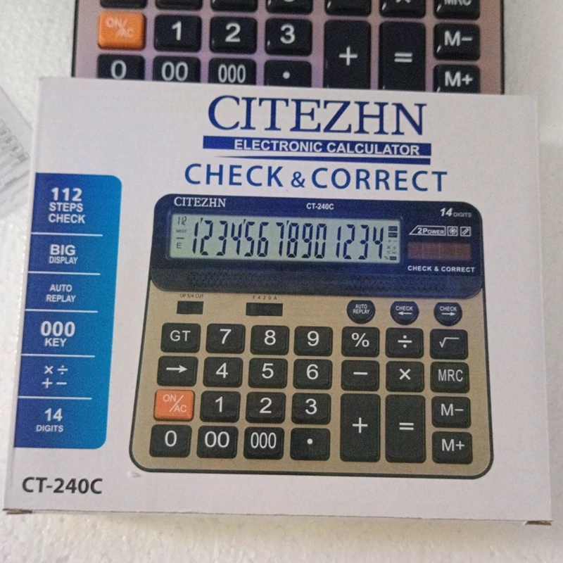 ماشینحساب سیتیزن مدل CT-240C یک ماشینحساب رومیزی و فروشگاهی است که در حدود 235 گرم وزن داشته و حمل آن ساده است. صفحهنمایش آن دیجیتال تکخطی است و قادر است تا 14 کاراکتر را نمایش دهد. منبع تغذیه این ماشینحساب باتری است .ابعاد این ماشینحساب 190x155x50 میلیمتر است که بهراحتی روی میز قرار میگیرد. اگر میخواهید در فروشگاه و یا محل کار خود از ماشینحساب استفاده نمایید. این ماشینحساب میتواند گزینه مناسبی برای شما باشد. هنگامیکه تصمیم به خرید ماشینحساب میگیرید، بهصورت خودکار گزینههای بسیاری از شرکتهای متعدد پیش روی شما قرار میگیرند؛ اما دراینبین از شرکتهایی که کیفیت را فدای کمیت نکرده، سیتیزن است. سیتیزن شرکتی است که در این حوزه فعالیت گستردهای دارد و به عرضهی محصولات باکیفیت شناخته میشود. این ماشینحساب دارای سلول نوری است. اگر شما در جستجو محصولی دقیق و با کیفیت هستید این گزینه را به شما معرفی میکنیم .