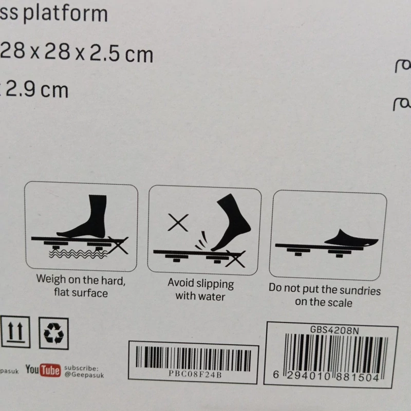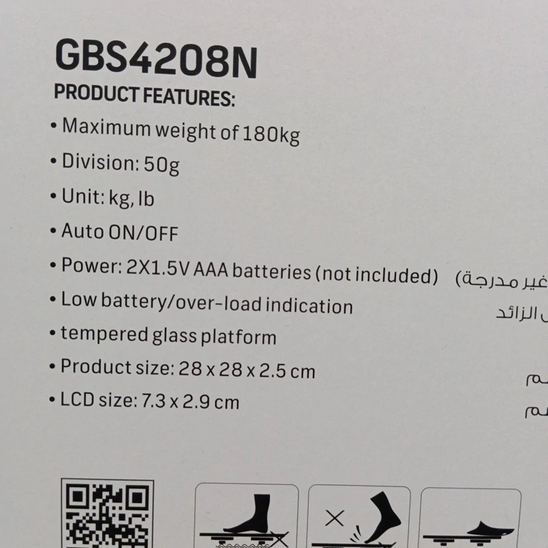 مشخصات ترازوی دیجیتال جیپاس مدل GBS4208N نمایشگر دیجیتال: نمایشگر LCD با نور پسزمینه که خواندن آن را در اتاقهای تاریک نیز امکانپذیر میسازد. حداکثر وزن: ظرفیت اندازهگیری تا 180 کیلوگرم. اندازه مناسب برای استفاده در خانههای مدرن. شیشه مقاوم: سطح شیشهای مقاوم و ضخیم با فضای کافی برای قرار دادن پاها، این ترازو از استحکام و ایمنی بالایی برخوردار است و در عین حال امکان ذخیرهسازی آسان را فراهم میآورد. ویژگیهای محصول: حداکثر وزن 180 کیلوگرم دقت اندازهگیری: 50 گرم واحدهای اندازهگیری: کیلوگرم، پوند خاموش و روشن شدن خودکار منبع تغذیه: 2 عدد باتری AAA (شامل نمیشود) نشانگر کمبود باتری و بار اضافی سطح شیشهای مقاوم ابعاد محصول: 28 x 28 x 2.5 سانتیمتر ابعاد نمایشگر LCD: 7.3 x 29 سانتیمتر ویژگیهای برجسته: ترازو دیجیتال جیپاس GBS4208N با حداکثر وزن 180 کیلوگرم و دقت بالا مناسب برای استفاده در منزل است. طراحی شیک و مقاوم، مناسب برای هر فضای داخلی. عملکرد خودکار با قابلیت خاموش و روشن شدن خودکار برای راحتی بیشتر در استفاده.