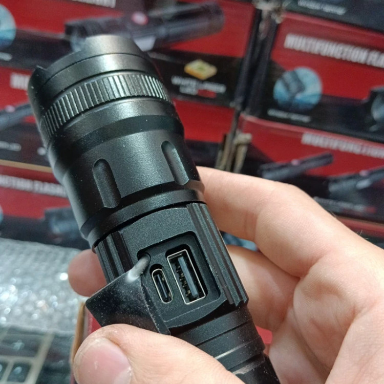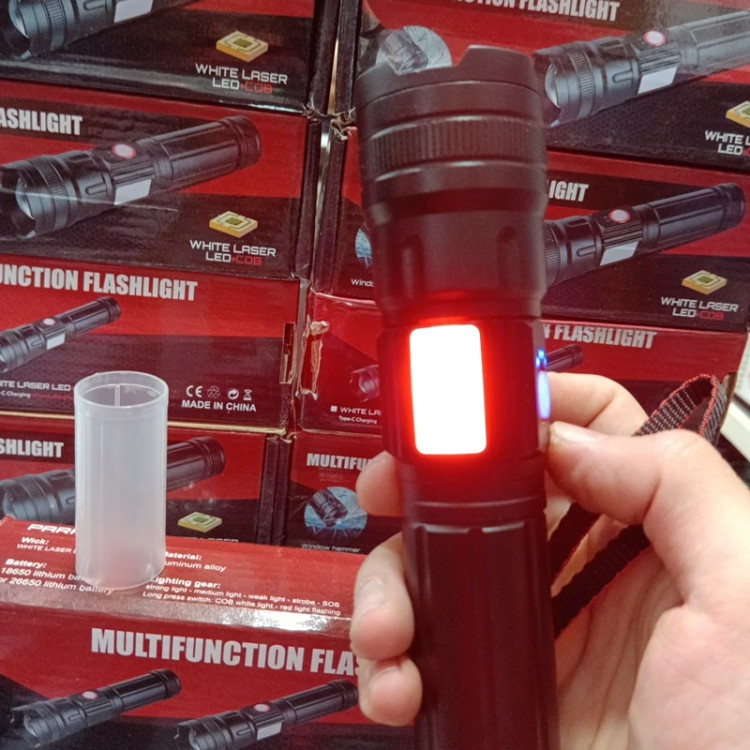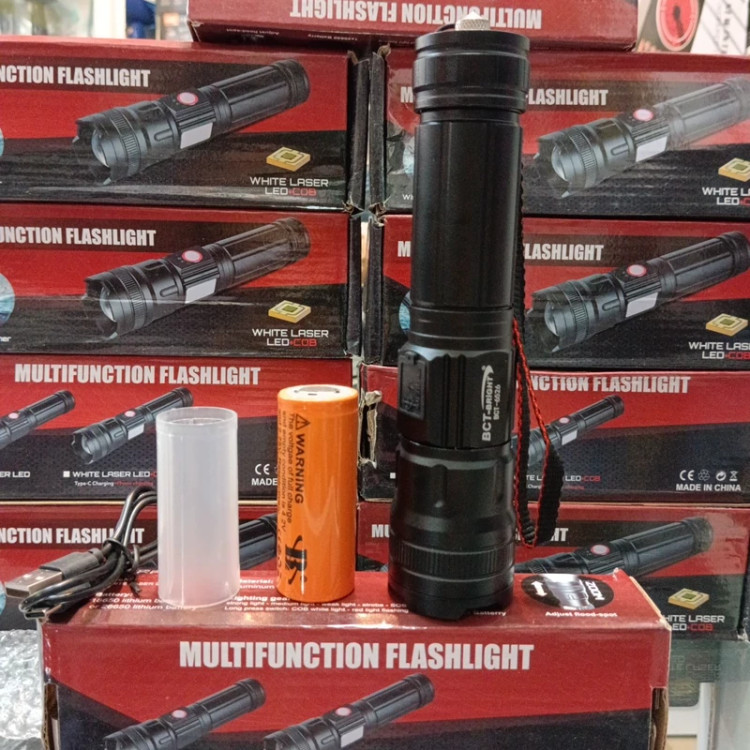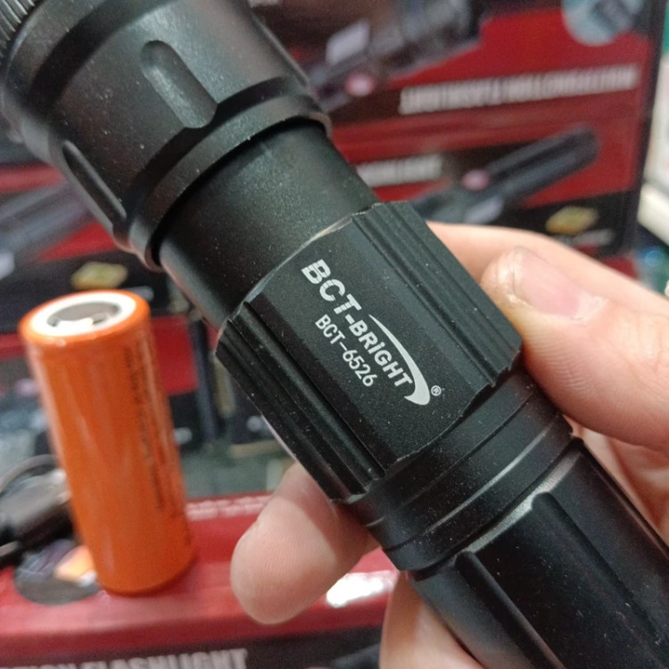 چراغ قوه دستی BCT-BRIGHT مدل Bct-6526 دارای زوم تلسکوپی درگاه شارژ تایپ سی خروجی usb باتری لیتیومی سایز 26650 و 8800میلی آمپر اقلام داخل بسته 1عدد چراغ قوه مدل 6526 1عدد کابل شارژ تایپ سی 1عدد باتری لیتیومی سایز 26650 1عدد تبدیل باتری به 18650 1عدد بند دستی